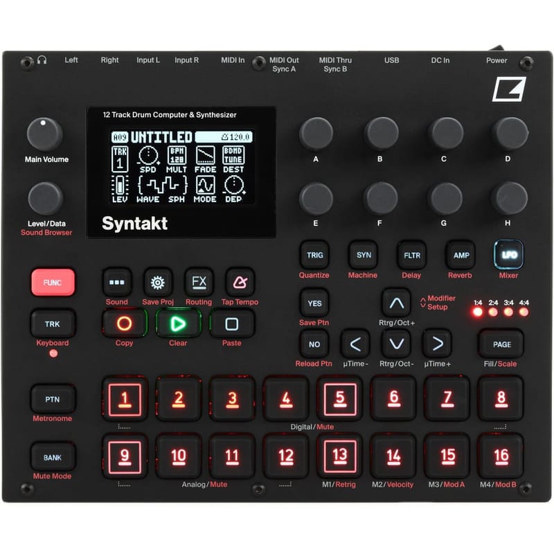 The Elektron Syntakt is a 12-track drum computer and synthesizer combining three analog drum voices, one analog cymbal voice, and eight digital synthesis engines. A dedicated FX track and 12 MIDI tracks round out the feature set. Over 40 machines — Elektron's term for synthesis algorithms — can be loaded onto any compatible track.